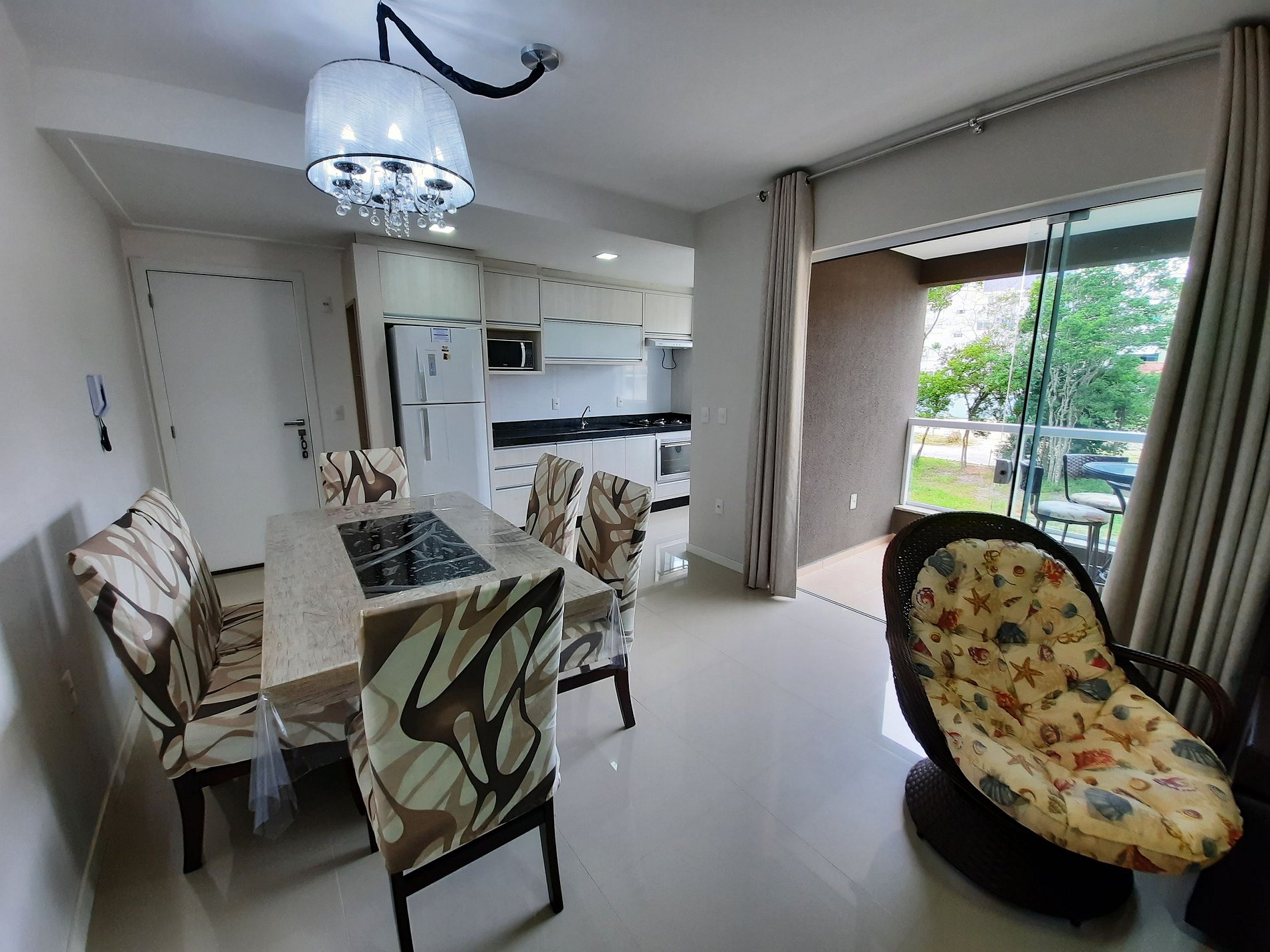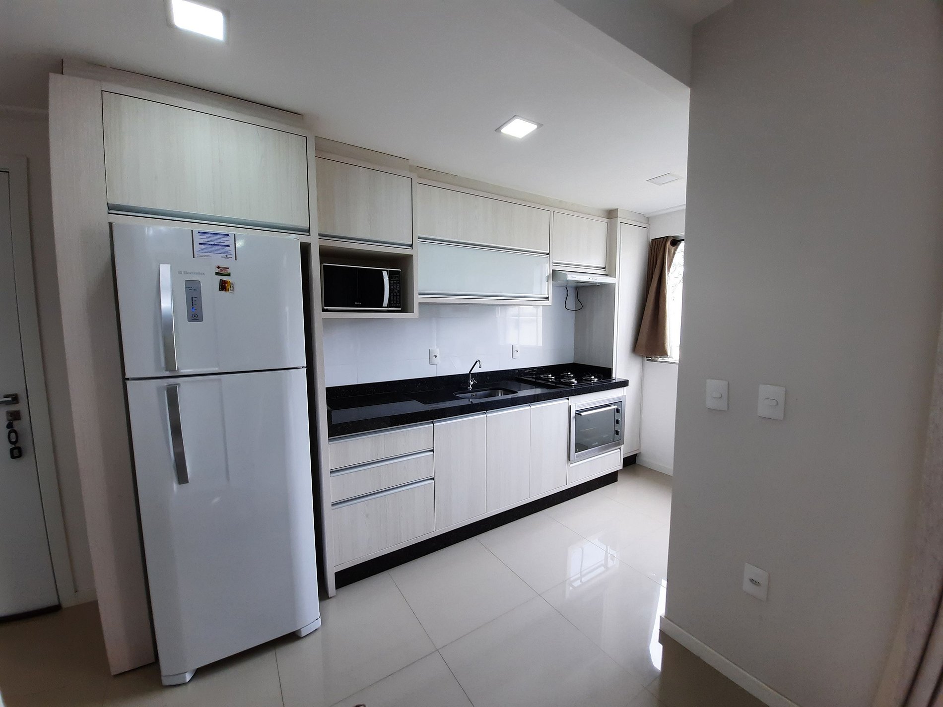 Cozinha com microondas, geladeira, fogão 4 bocas
