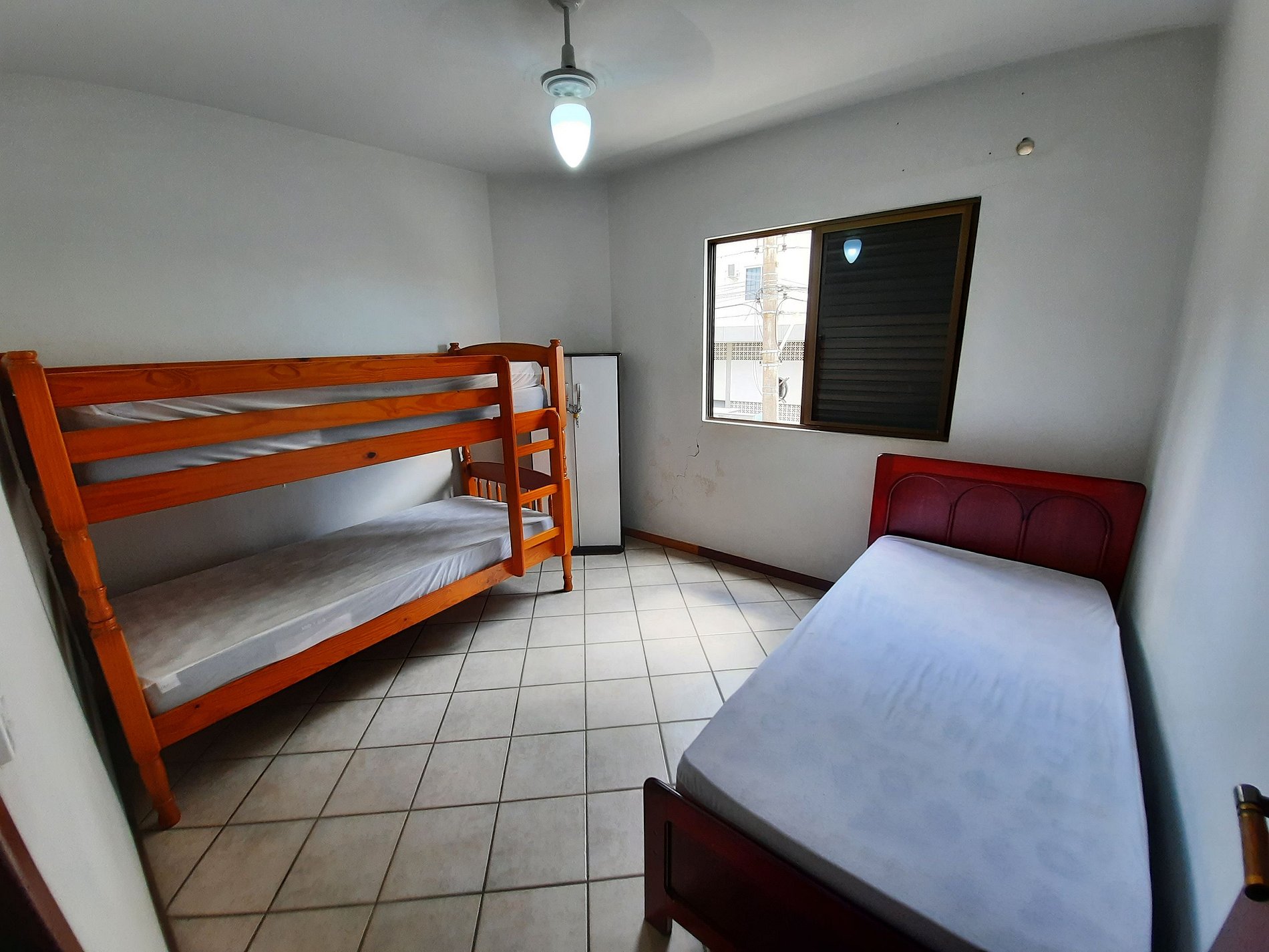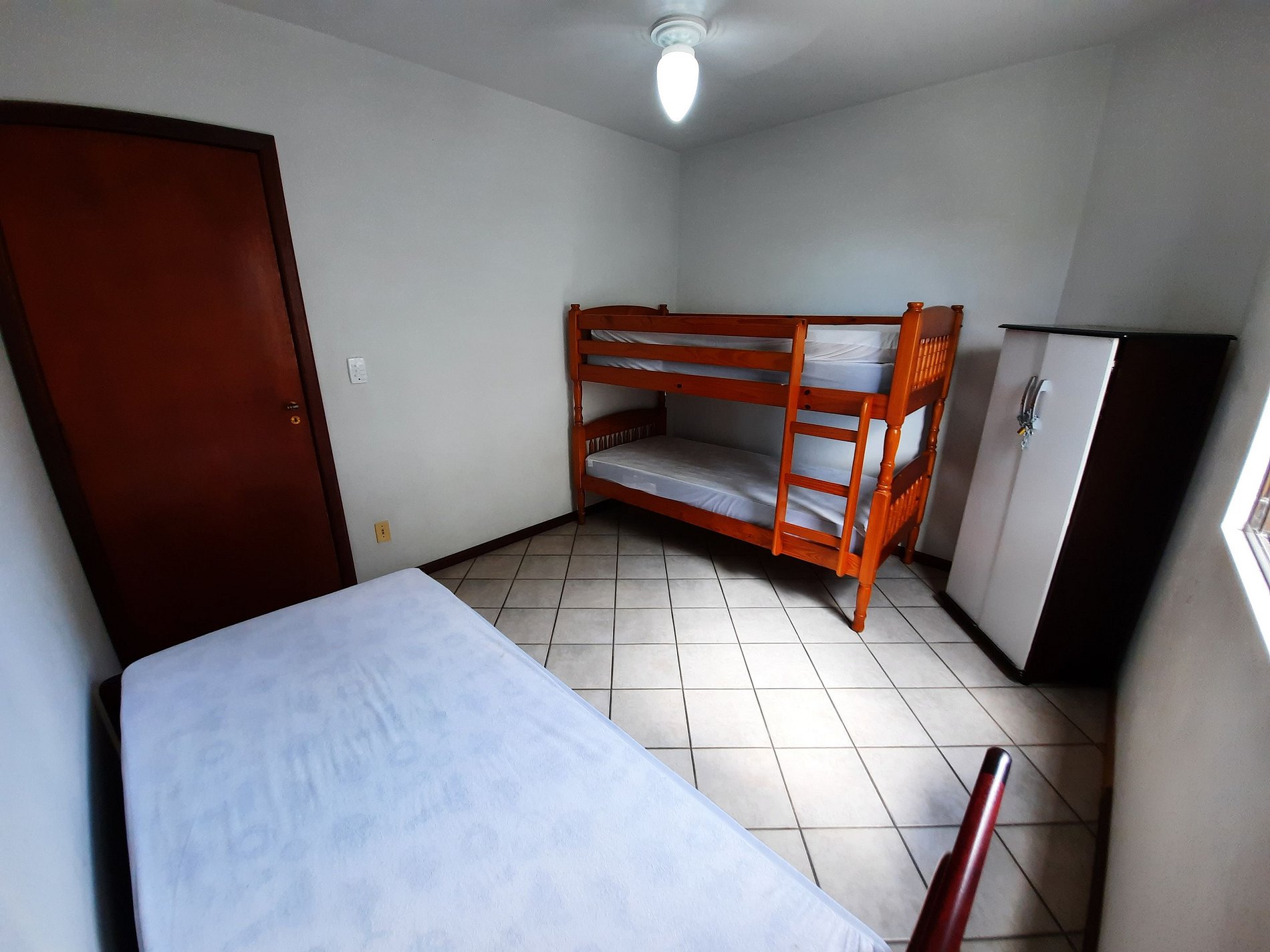 1 dormitório com cama de solteiro e auxiliar mais uma beliche mais 01colchão extra de solteiro;