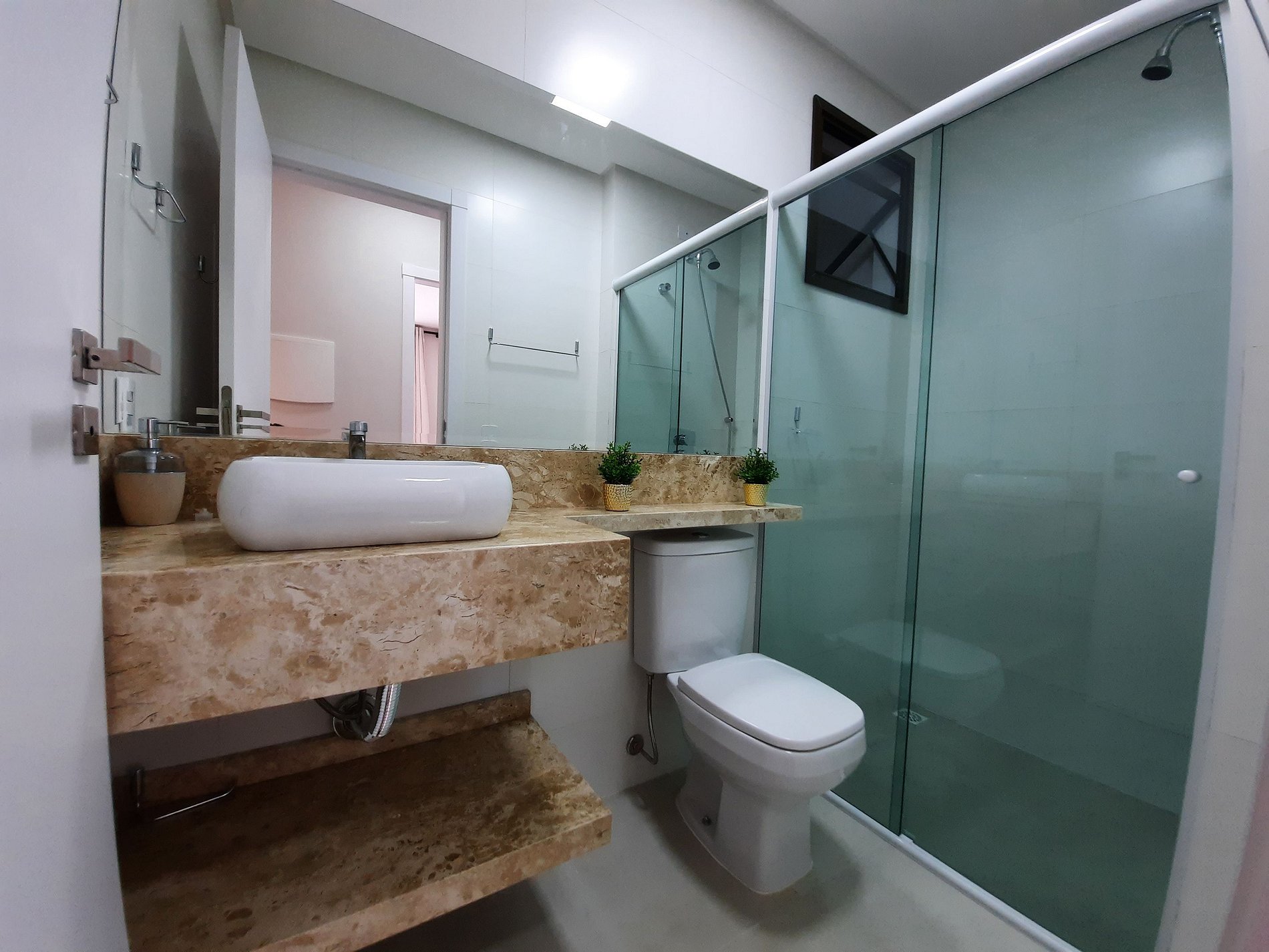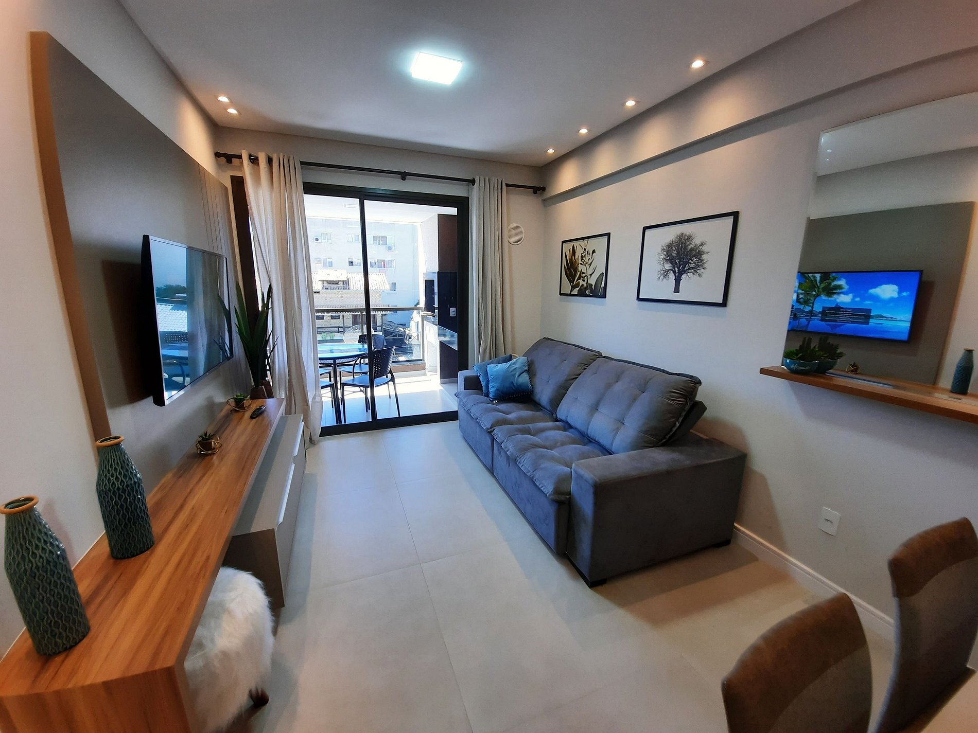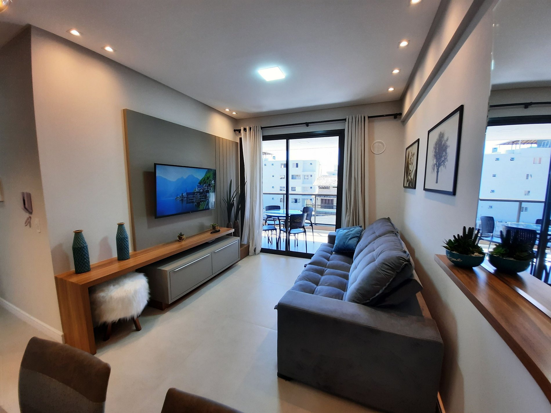 Sala com sofá, TV 50 polegadas, mesa de jantar com 4 cadeiras e AR condicionado;