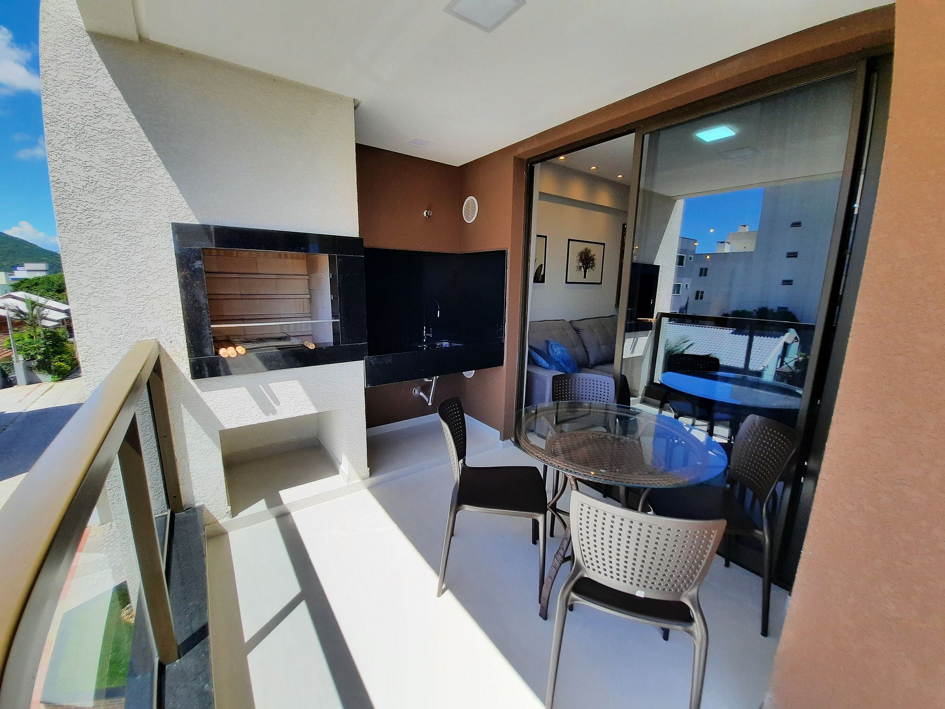 Sacada com churrasqueira de frente para rua com mesa e 4 cadeiras;