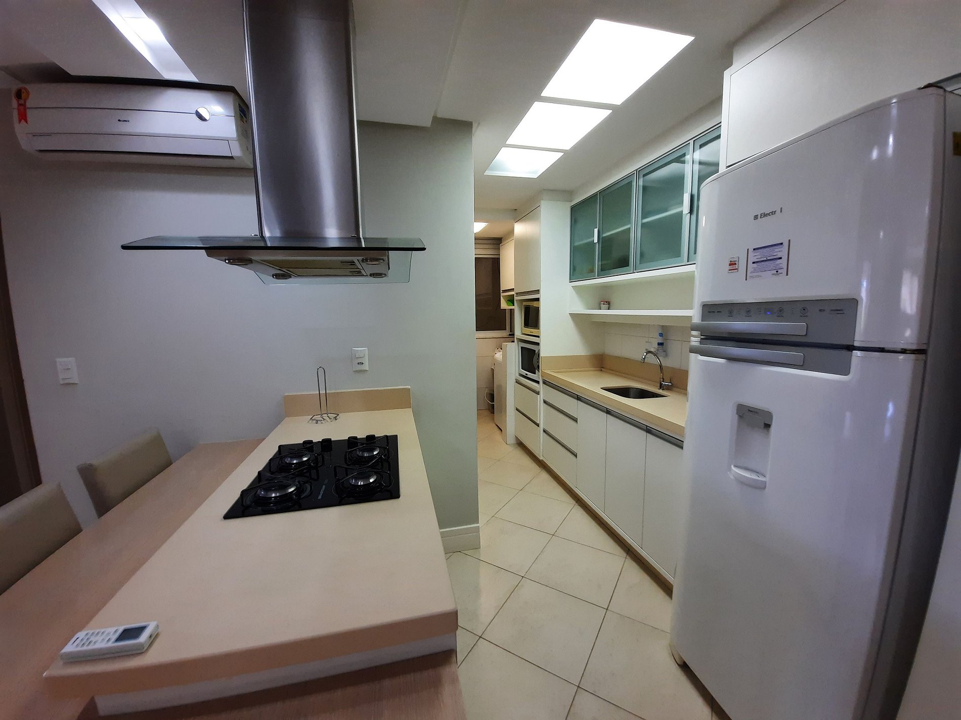 Cozinha com bancada com 4 cadeiras, geladeira, microondas, fogão e demais utensílios básicos;