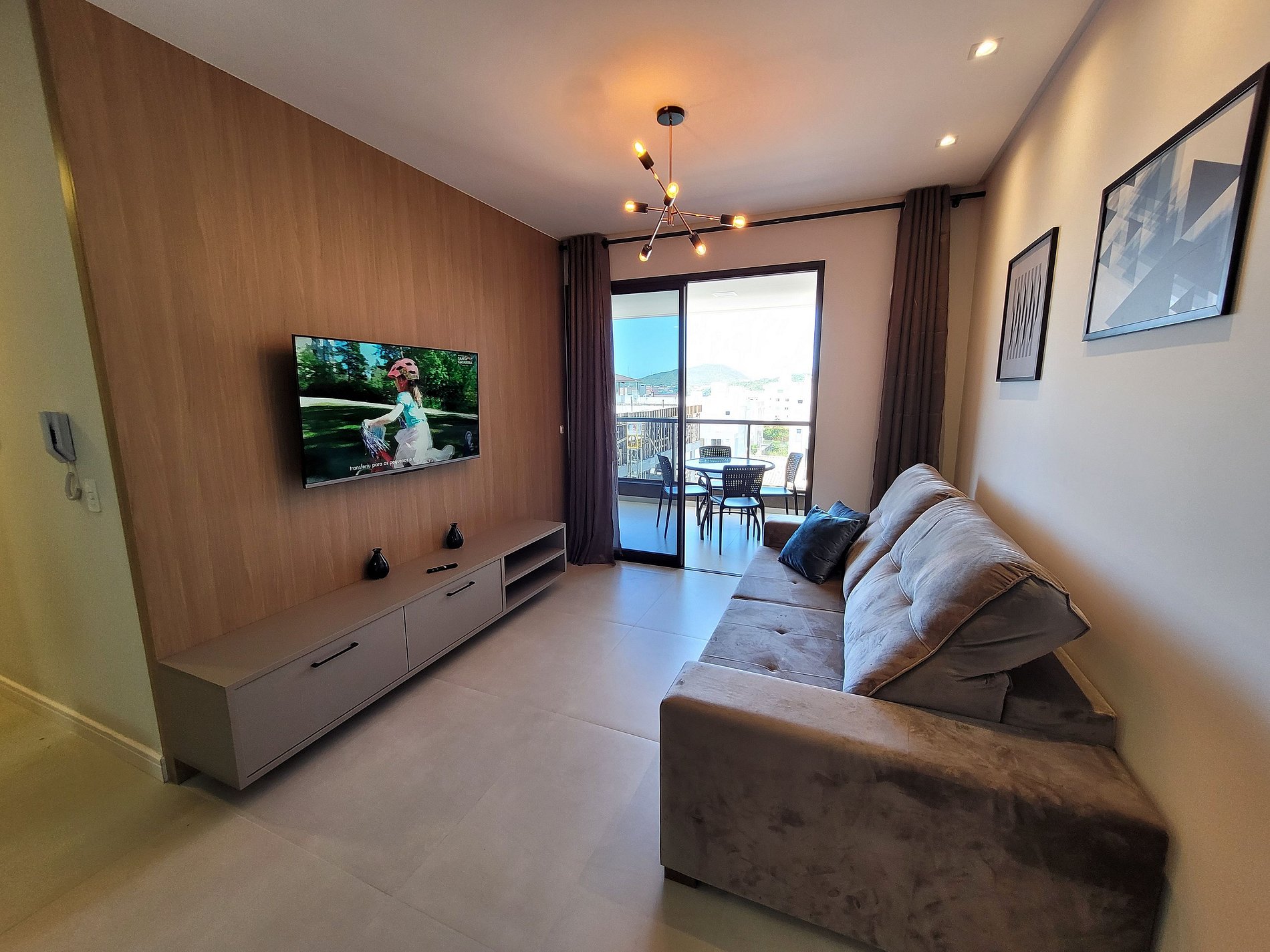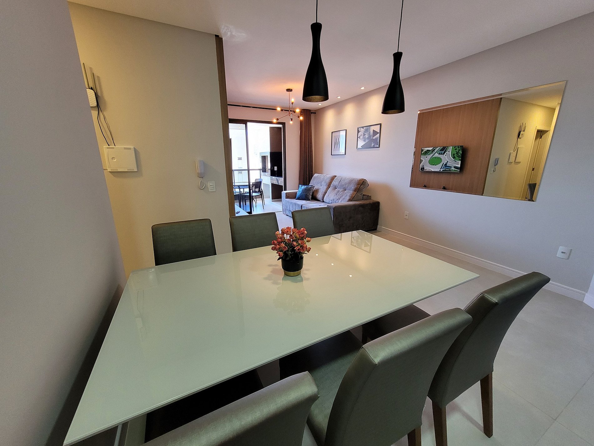 Sala com sofá, smart tv 50, mesa de jantar com 6 cadeiras.
