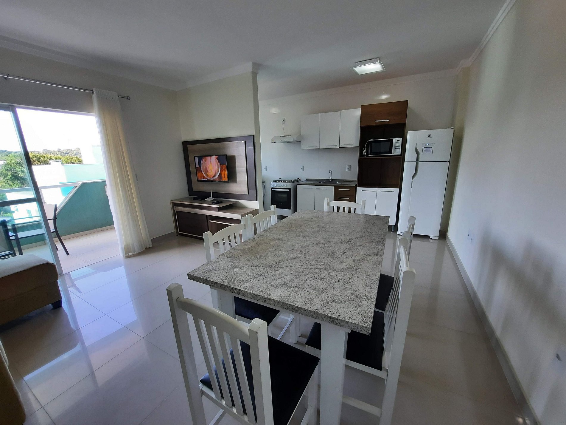 Cozinha com geladeira, fogão e microondas e demais utensílios básico