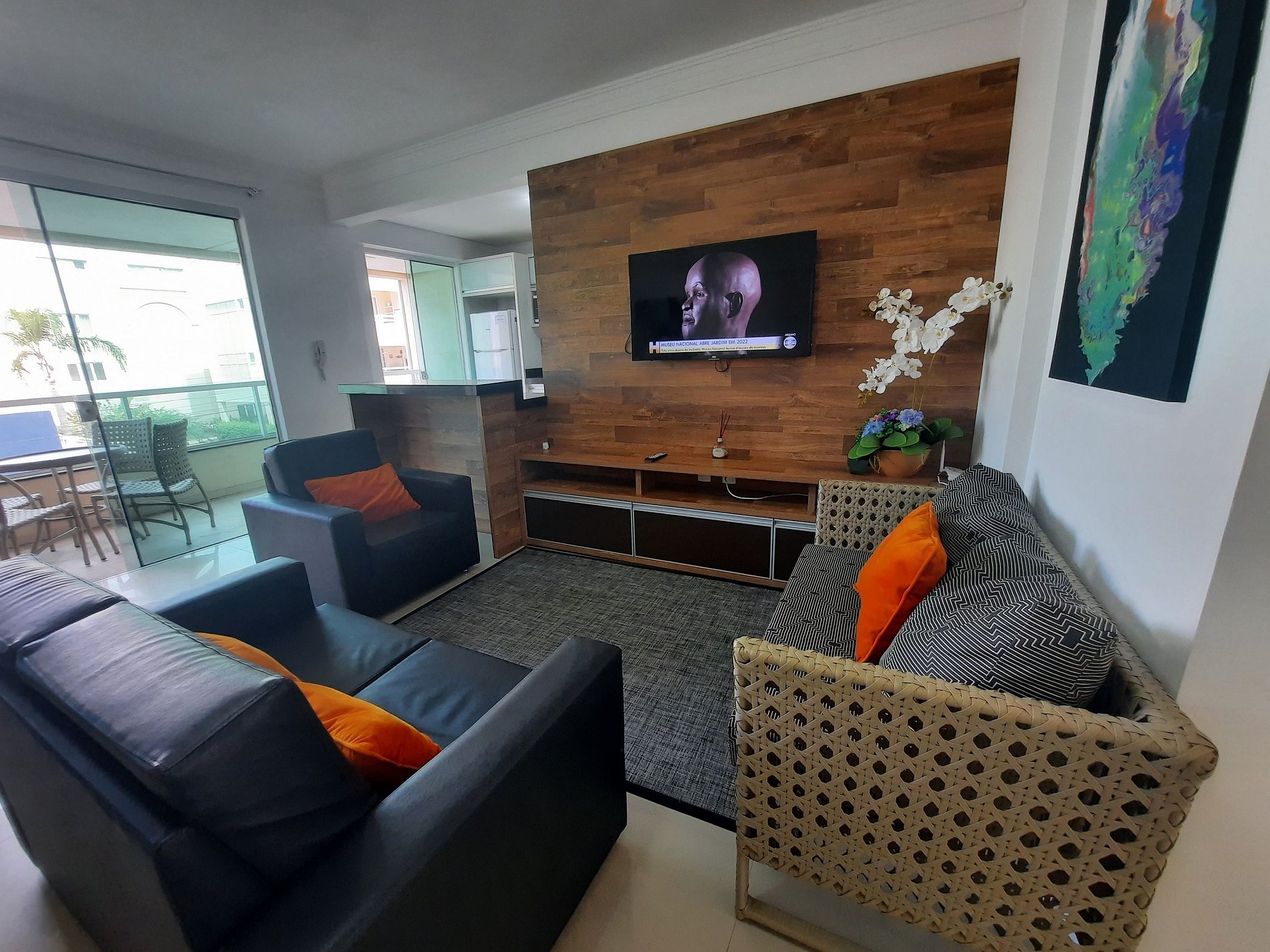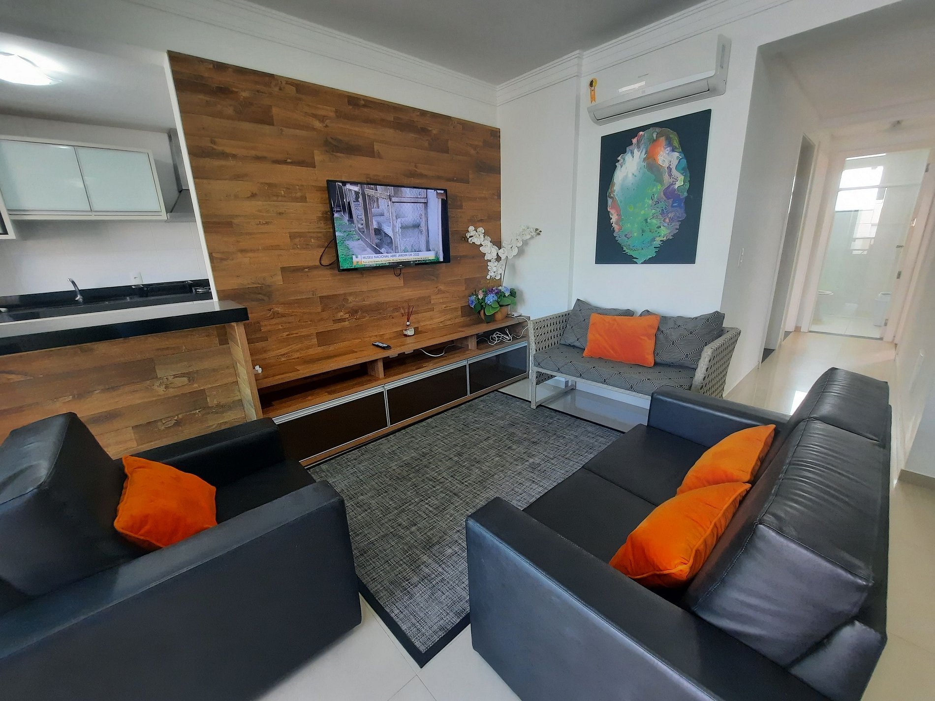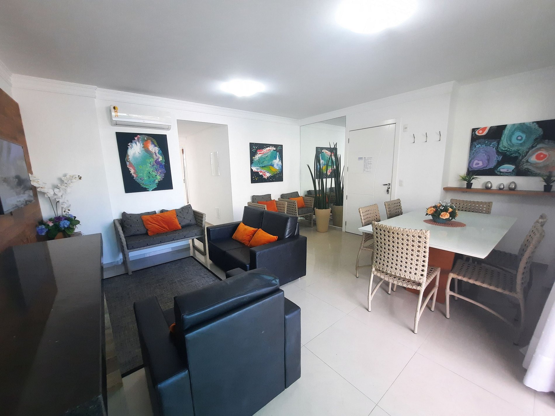 Sala de jantar e estar muito aconchegante, com TV e ar condicionado;