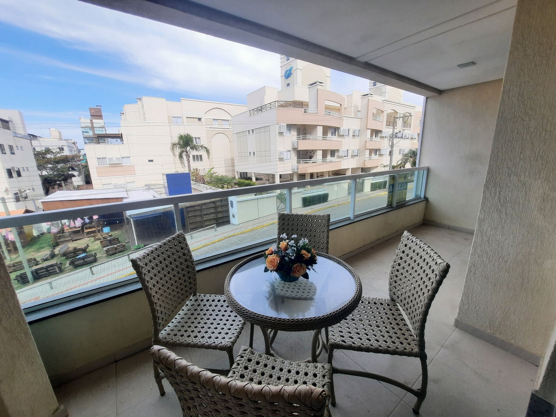 Ampla sacada com churrasqueira, mesa com cadeiras e VISTA PARA O MAR;