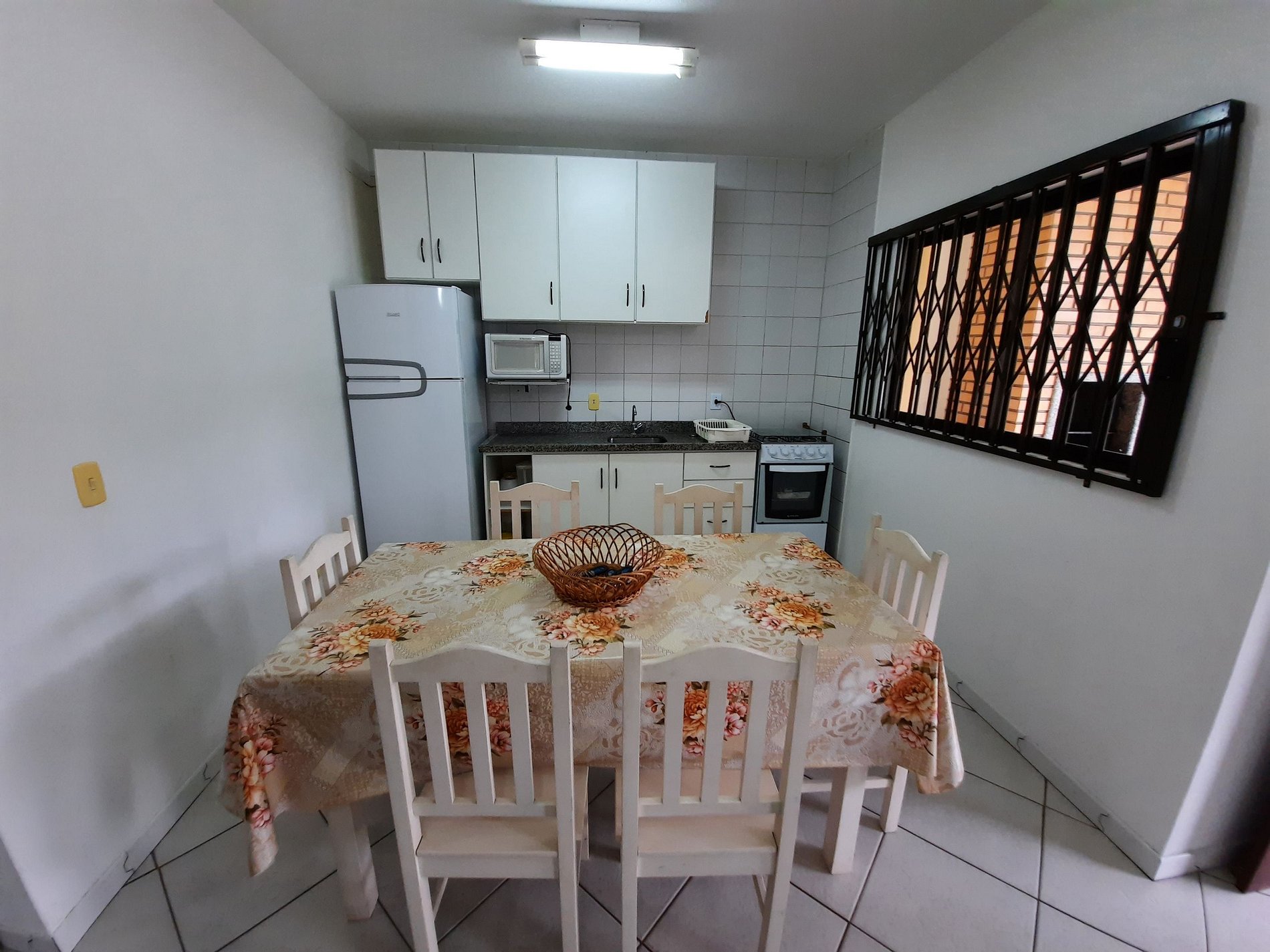 Cozinha com micro-ondas, geladeira, fogão 4 bocas e demais utensílios básico