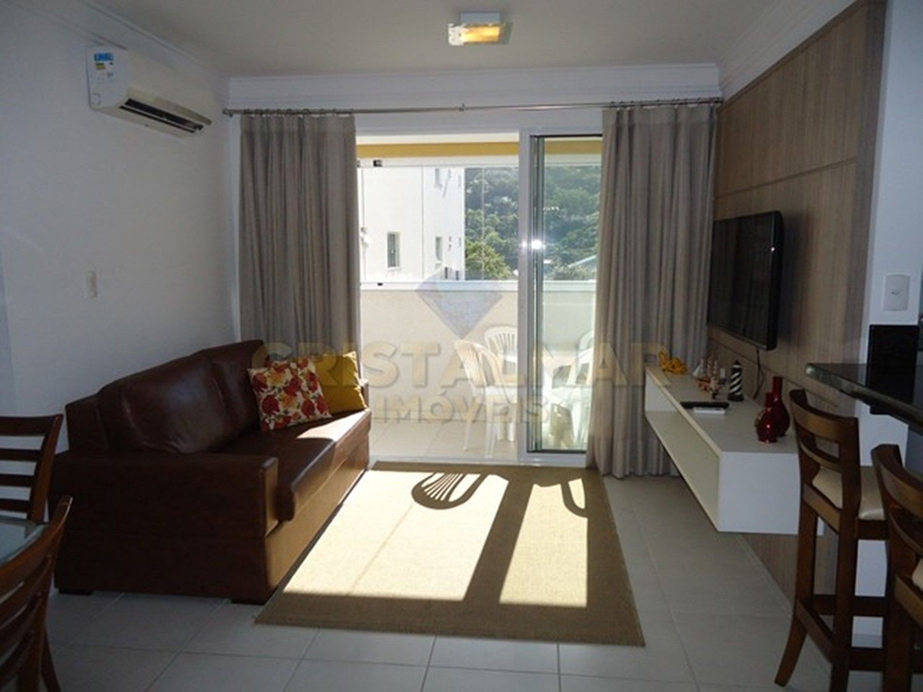 Sala de estar com sofá cama, TV e ar condicionado;