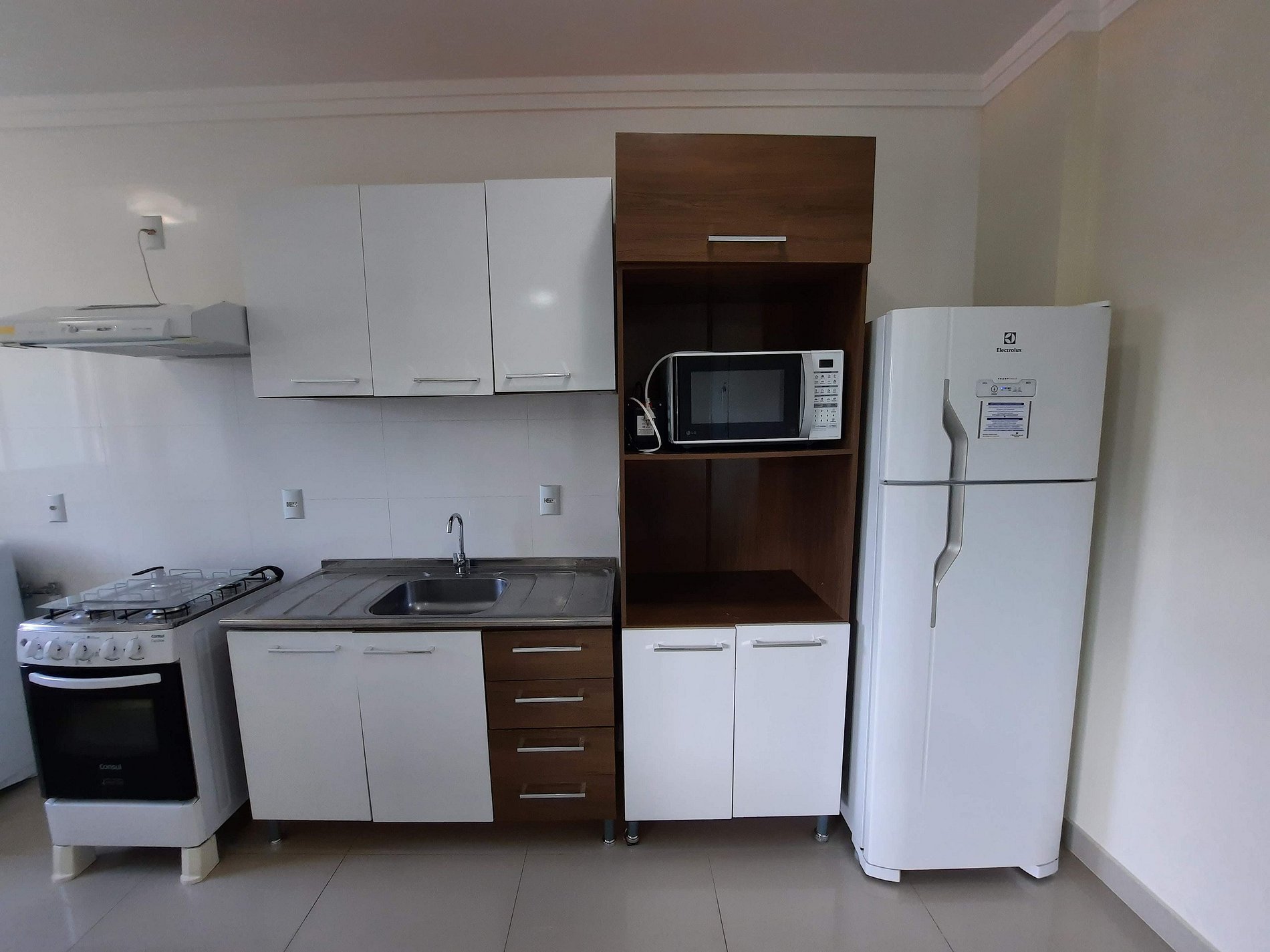 Cozinha com geladeira, fogão e microondas e demais utensílios básico